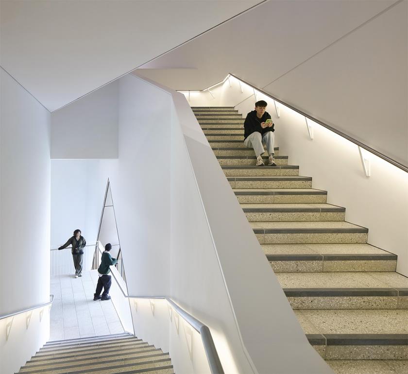 Il nuovo edificio si presenta come un volume di cinque piani caratterizzato da una forte identità materica e da una composizione architettonica che trae ispirazione dal concetto giapponese di Ma, lo “spazio intermedio”, inteso come elemento attivo tra pieno e vuoto. La struttura si sviluppa attraverso una sequenza di piani interconnessi, che alternano aree espositive, spazi pubblici e terrazze, costruendo un sistema fluido in cui la visita diventa esperienza spaziale continua più che percorso lineare.