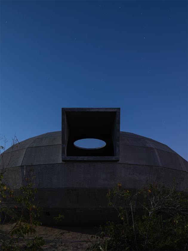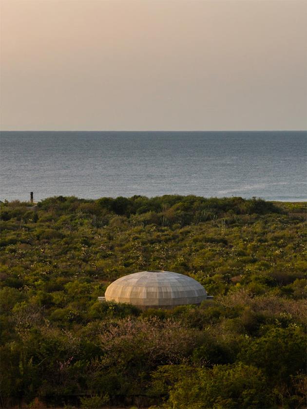 Costruito con tecnologie costruttive locali, il padiglione riflette anche un’attitudine responsabile verso il territorio. La scelta di scavare piuttosto che edificare in altezza o con volumi estranei al luogo riduce l’impatto visivo e ambientale, integrando lo spazio nella geografia preesistente. Questo orienta inevitabilmente anche la logica costruttiva: materiali naturali, superfici semplificate, dettagli minimali e una sensibilità verso il clima arido della costa messicana. L’architettura risponde alle esigenze di comfort termico con strategie passive, sfruttando la massa del terreno come isolante naturale, e la cupola come elemento di ventilazione naturale.