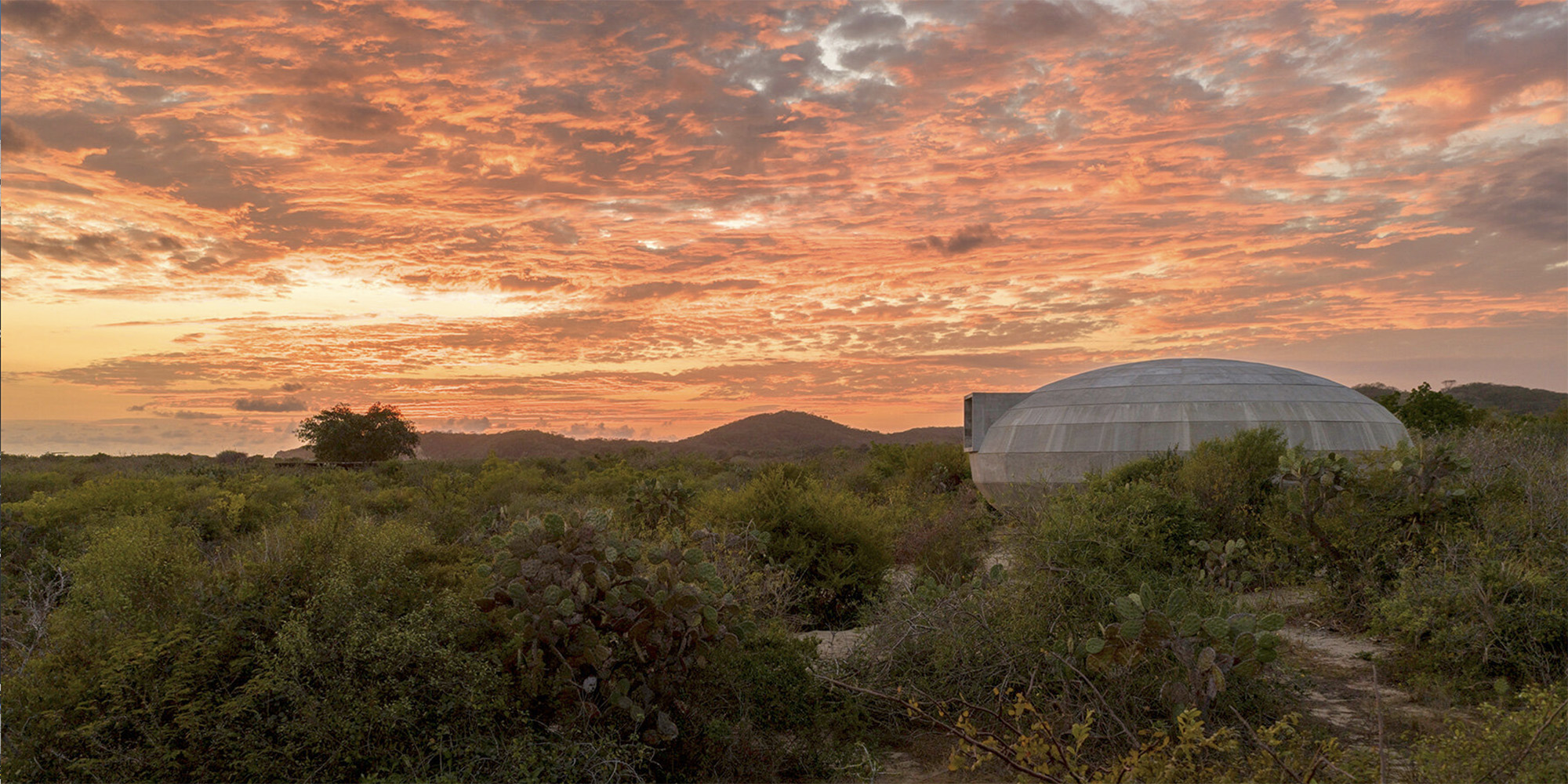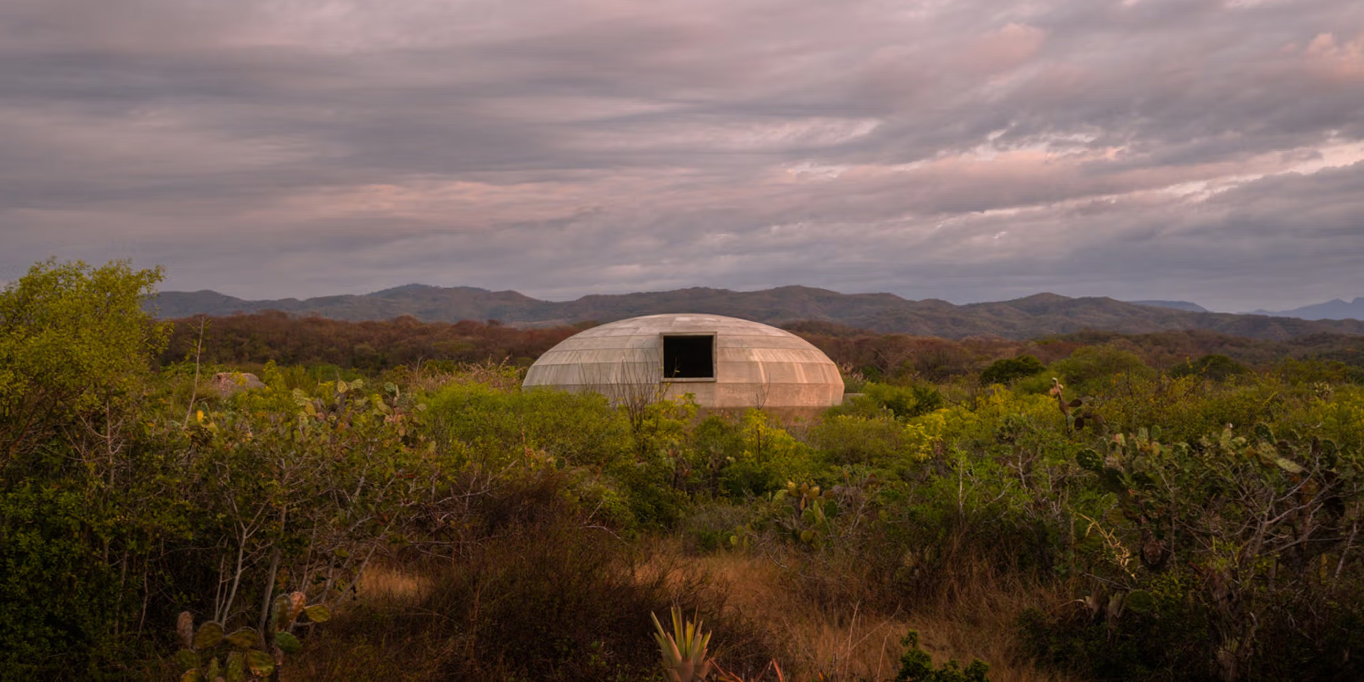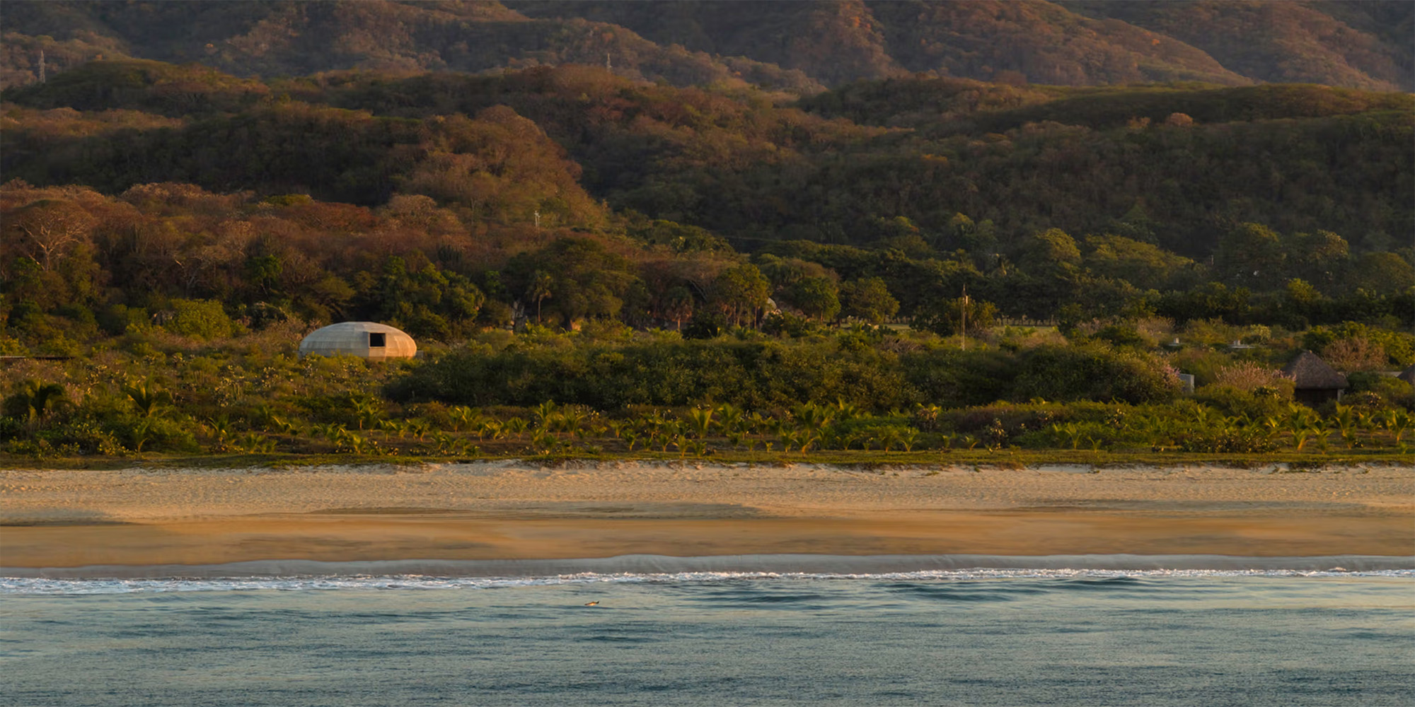 Il risultato è un padiglione narrativo: l’architettura non si alza sopra il suolo, ma si cala in esso, suggerendo una relazione più profonda con le forze orizzontali del paesaggio di Mazunte. La superficie esterna appare come un “bucho” scavato, affinato nella sua geometria di volta, pronta a catturare luce, vento e suono, invitando l’utente a entrare in un’altra dimensione percettiva. La forma a cupola è liscia e pura: un richiamo alla semplice perfezione delle camere a volta classiche, ma declinata in un linguaggio assolutamente contemporaneo.