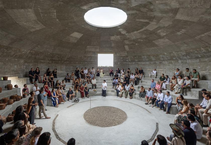 La sfida di OMA — lo studio fondato da Rem Koolhaas e ora guidato da David Gianotten — non è stata quella di imporre una forma aliena al paesaggio, ma piuttosto di estrarre una presenza architettonica dall’interno della terra stessa. Il padiglione è infatti concepito come una cavità scavata nel terreno: un volume a cupola parzialmente interrato che suggerisce un dialogo con l’architettura vernacolare preispanica e con le grotte naturali, evocando riferimenti ancestrali di spazio santo e spazio creativo.