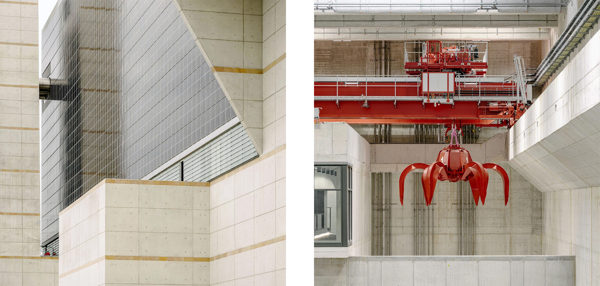 Il progetto si distingue per la sua capacità di integrare funzionalità e estetica. La struttura è composta da un massiccio basamento in calcestruzzo, che ospita le linee di incenerimento, e una superstruttura più leggera, quasi come una carrozzeria, che racchiude la sala macchine. Questa divisione non solo chiarisce le proporzioni e le funzioni, ma conferisce all’edificio una presenza monumentale, pur mantenendo un senso di leggerezza e modernità.