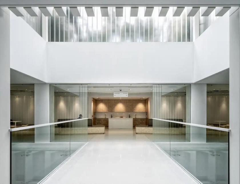 Gli spazi interni sono progettati per una massima flessibilità d’uso: pavimenti flottanti, moduli acustici rimovibili, pareti mobili e sistemi di distribuzione impiantistica a innesto rapido permettono una riconfigurazione completa degli ambienti in meno di 24 ore. Aree di coworking, sale riunioni ipertecnologiche, zone relax, corti interne e terrazze verdi garantiscono un workplace fluido che favorisce interazione, creatività e benessere. Il 90% delle postazioni beneficia di luce naturale diretta e vista verso il paesaggio, riducendo lo stress visivo e migliorando la qualità ambientale interna.