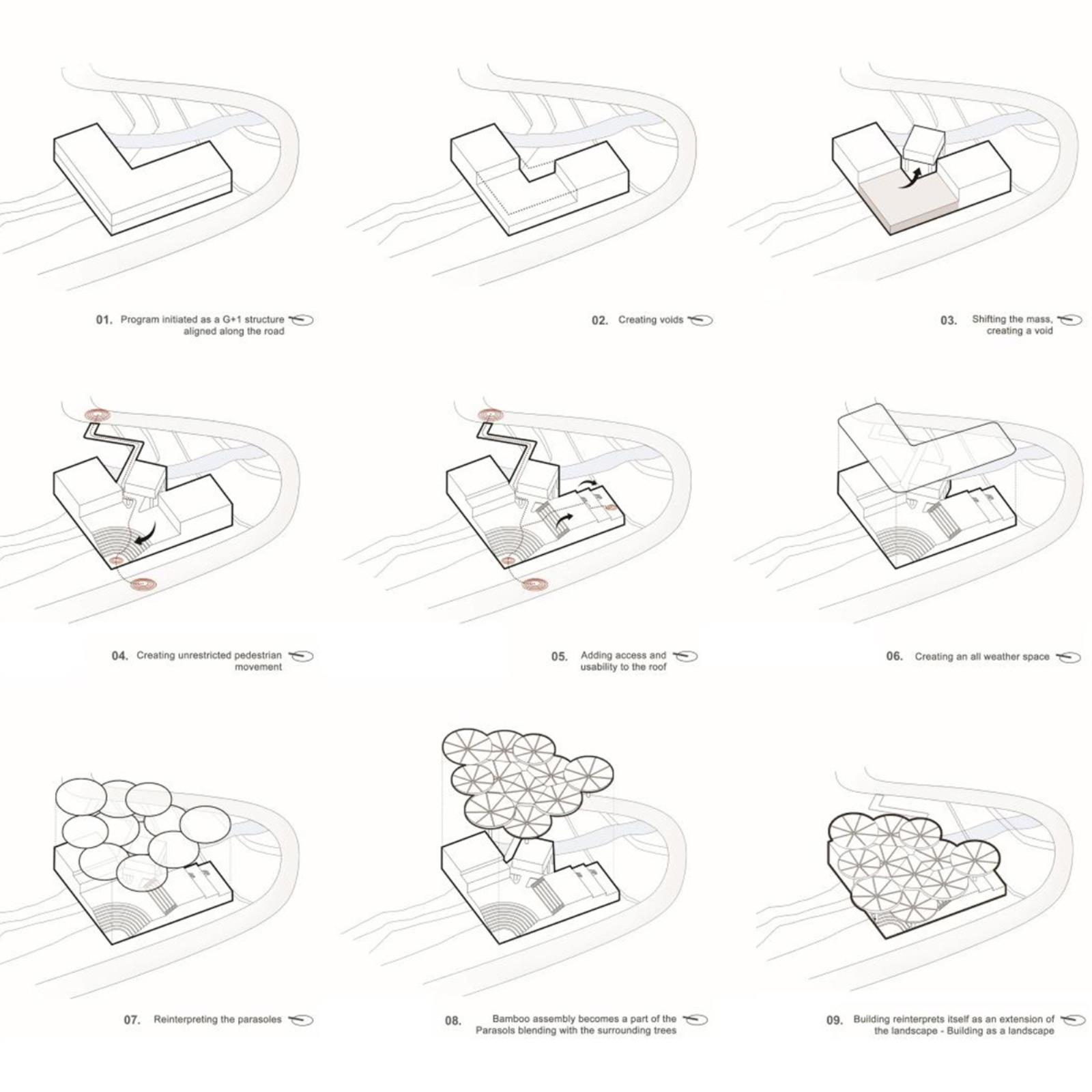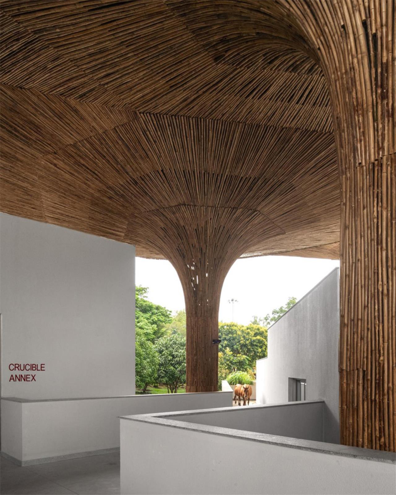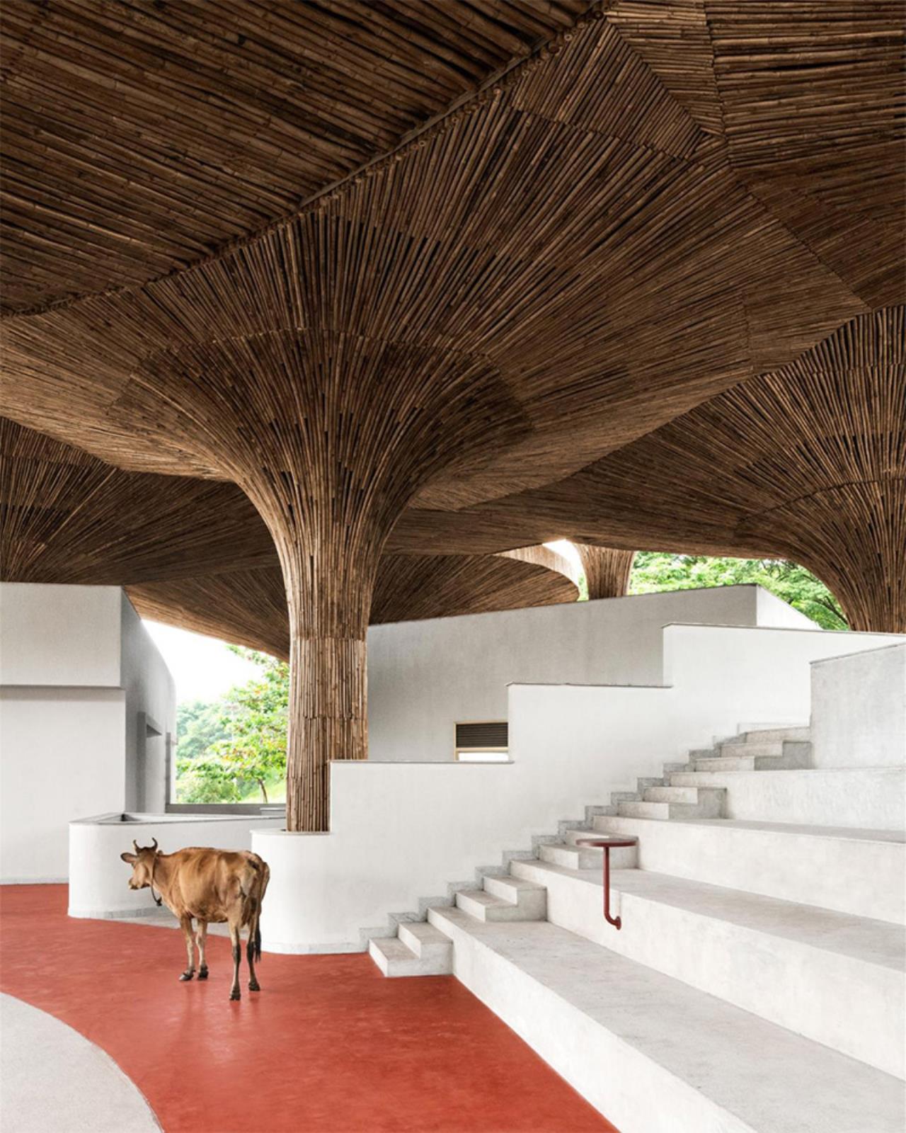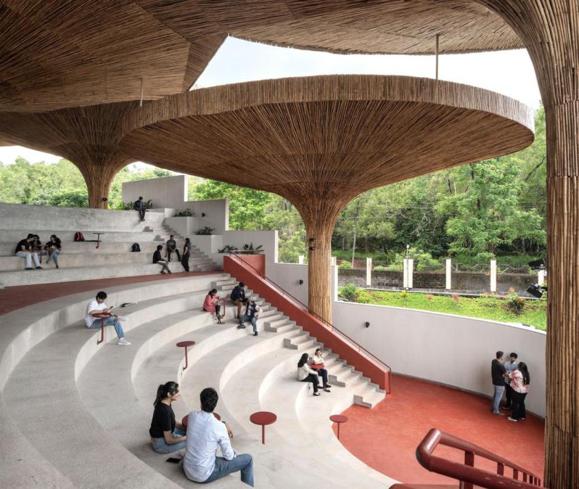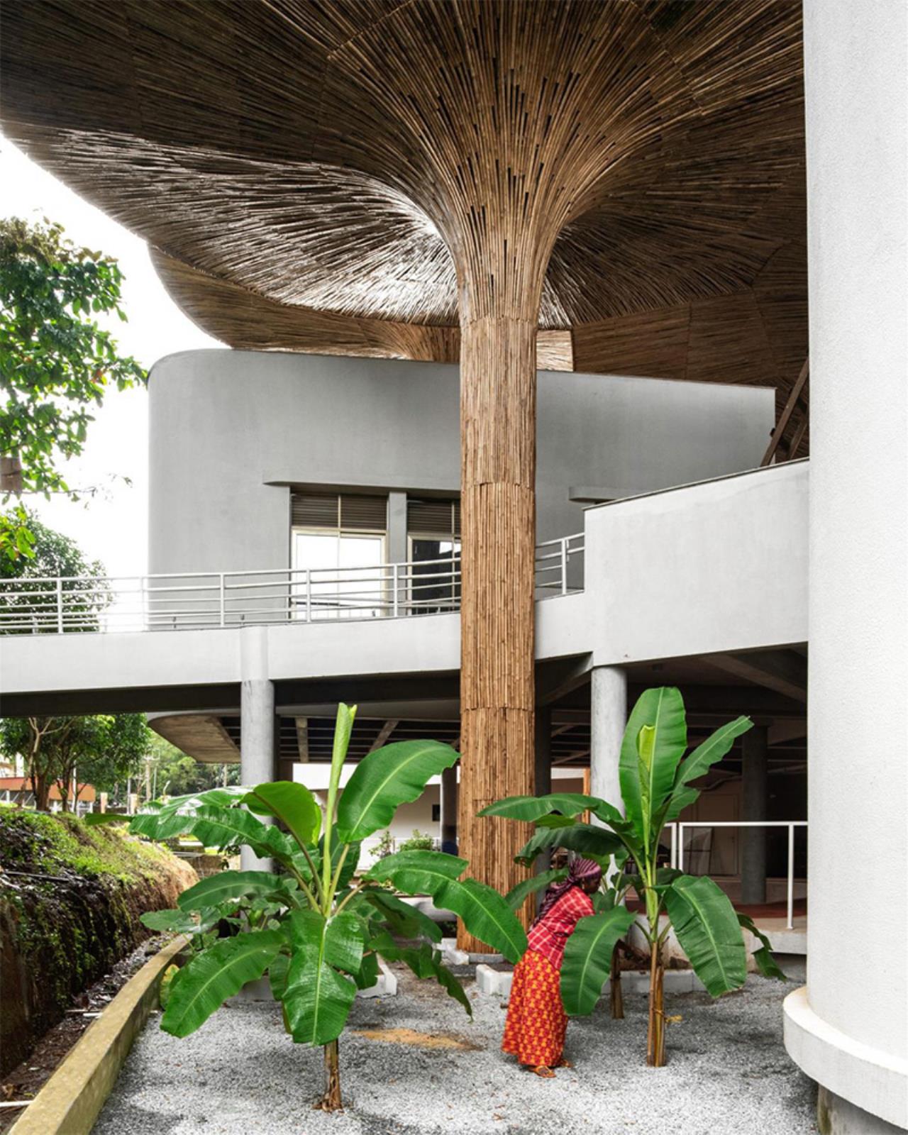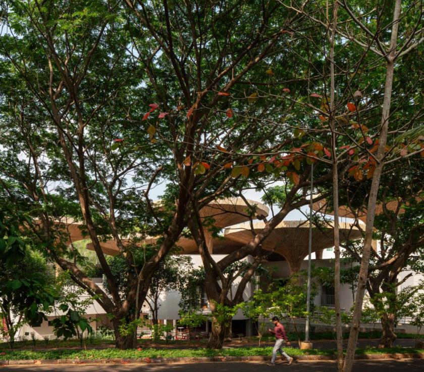Elemento iconico, ma profondamente funzionale sono i parasoli in bambù intrecciato collocati sulla terrazza superiore. Ispirati ai chhatris tradizionali, questi dispositivi filtrano la luce solare, proteggono dalla pioggia e creano microclimi confortevoli per lo studio e l'incontro. Il bambù, materiale leggero e rinnovabile, viene utilizzato non come decorazione, ma come infrastruttura climatica costruita insieme ad artigiani locali.