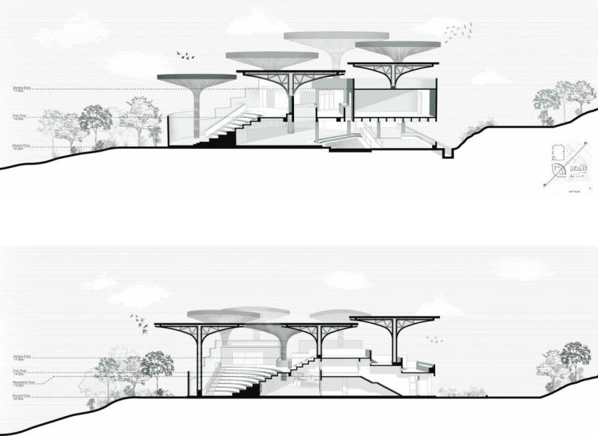 Il rapporto con il suolo è uno degli aspetti più significativi del progetto. Il centro si sviluppa su due livelli principali, adattandosi alla pendenza naturale del terreno e riducendo al minimo le operazioni di sbancamento. La topografia non viene corretta, ma amplificata, diventando struttura distributiva e dispositivo climatico. I dislivelli generano ombra, ventilazione naturale e punti di sosta informali, trasformando il percorso in esperienza.