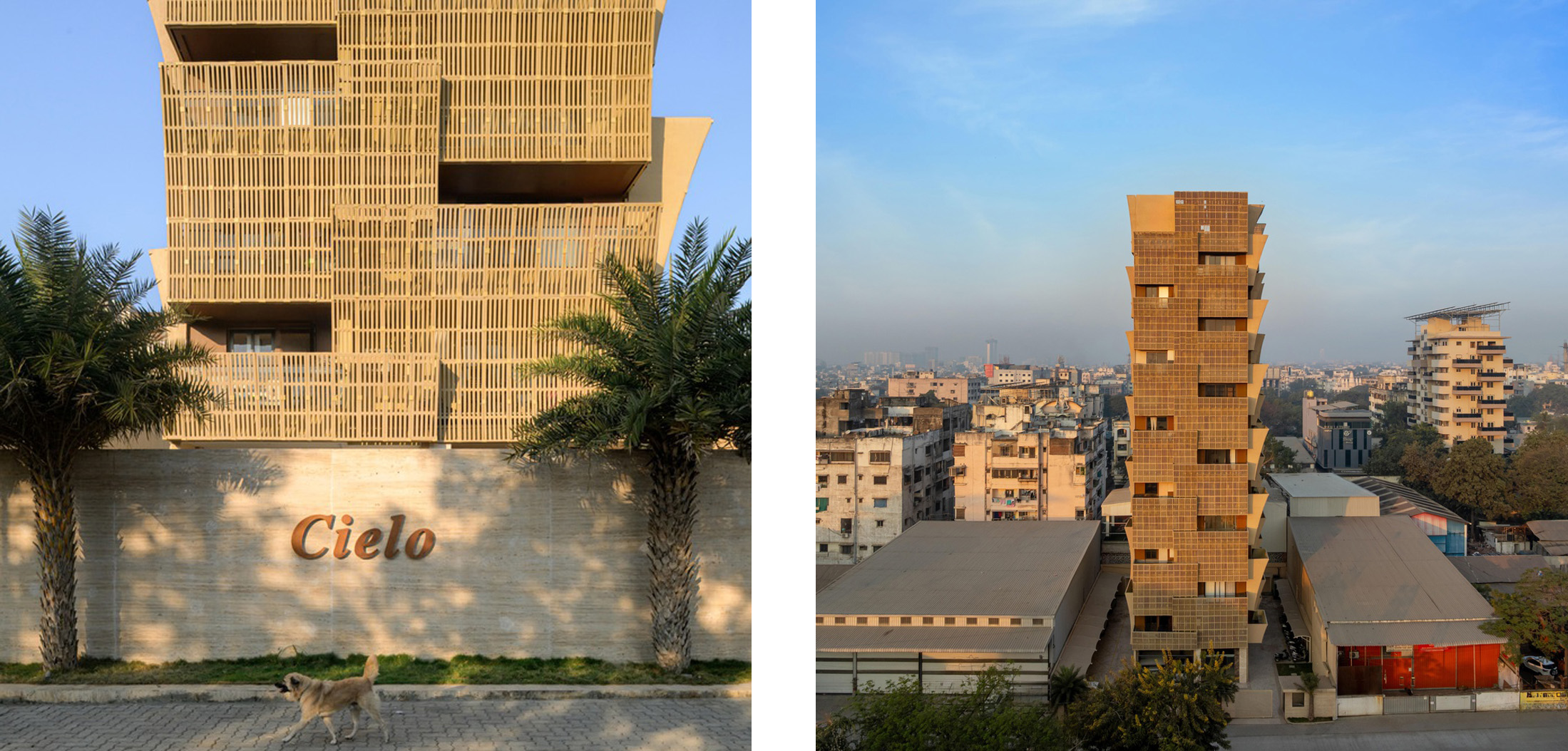 Una delle innovazioni più sorprendenti di Cielo Apartment riguarda la sua facciata dinamica e protettiva: ogni stanza si apre su due balconi distinti, uno completamente aperto e uno schermato. I balconi schermati non sono meri elementi decorativi, ma sono progettati come vere e proprie barriere climatiche — sezioni curve che offrono ombra, mitigano l'irraggiamento diretto e, allo stesso tempo, creano spazi esterni fruibili e protetti. Il motivo delle schermature si ispira alle tradizionali jali dell'architettura indiana, utilizzate storicamente per filtrare luce e aria, e qui reinterpretate in chiave contemporanea.
