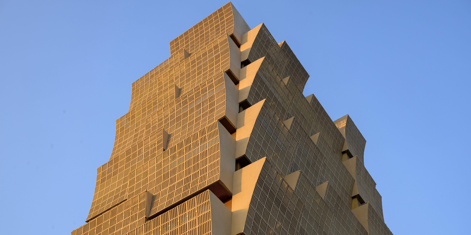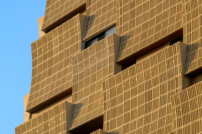 Queste schermature alternate orizzontalmente e verticalmente non solo riducono significativamente il guadagno di calore interno, ma conferiscono anche all'edificio una qualità scultorea, trasformando la facciata in una superficie vibrante e ritmica. Ogni unità abitativa beneficia così di spazi esterni che offrono protezione dal sole diretto ma consentono allo stesso tempo di respirare il clima locale — un equilibrio attento tra apertura e protezione.