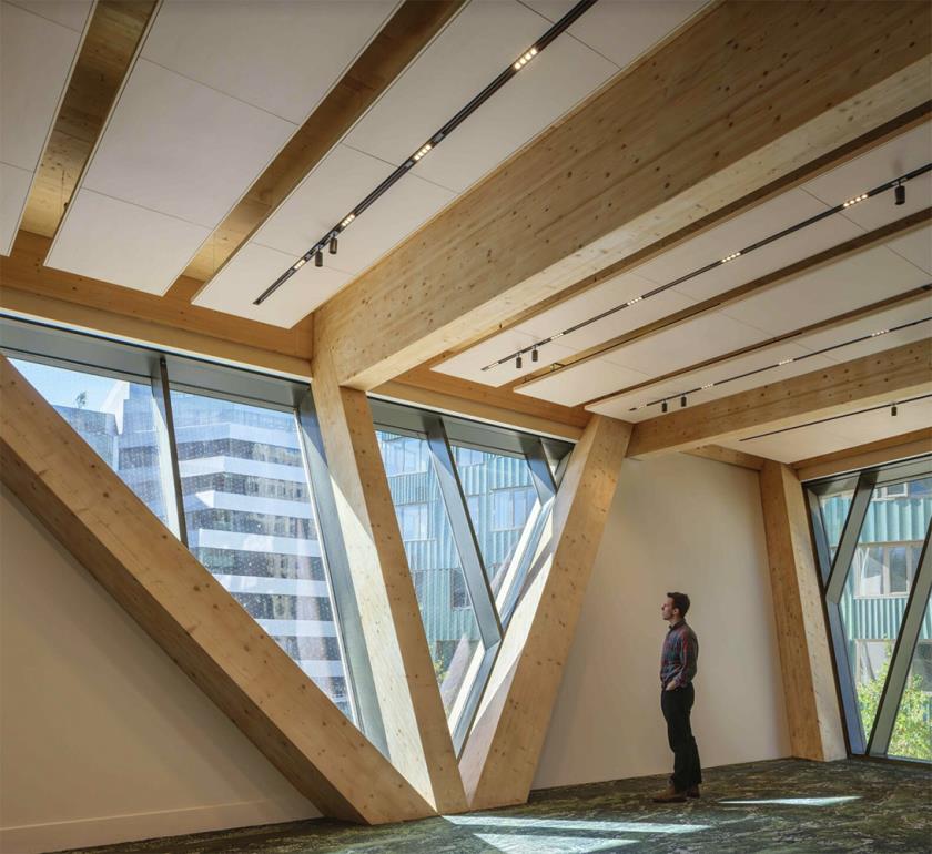 Studio Gang affronta il progetto come un organismo che si sviluppa verso l’alto, sorretto da un sistema di pilastri in legno lamellare che ricordano tronchi e biforcazioni, ma che rispondono a criteri rigorosi di efficienza statica e ottimizzazione dei carichi.