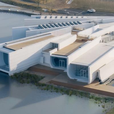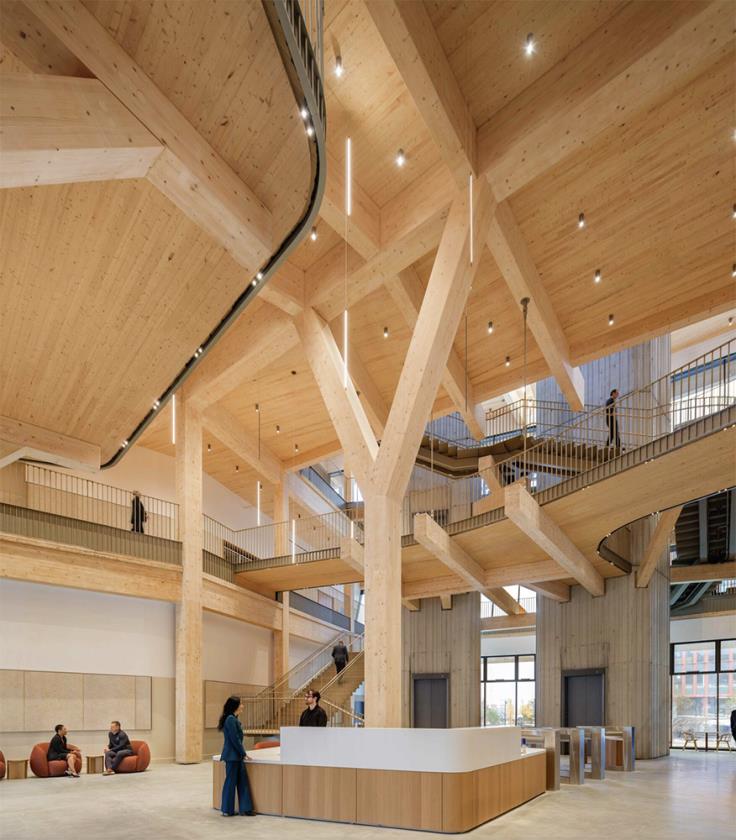 Il volume esterno è rivestito in cedro dell’Alaska, selezionato per stabilità e durabilità, in grado di sviluppare nel tempo una patina naturale che armonizza l’edificio con il contesto circostante. La massa lignea è alleggerita da superfici vetrate profonde e da pilastri ramificati in legno massiccio disposti a “V”, ottimizzando la distribuzione dei carichi verticali e riducendo l’uso di acciaio. Le travi biforcate sono progettate con calcoli strutturali avanzati per garantire ampie campate senza irrigidimenti eccessivi, e per offrire allo stesso tempo un’espressività formale che richiama la biomimesi.