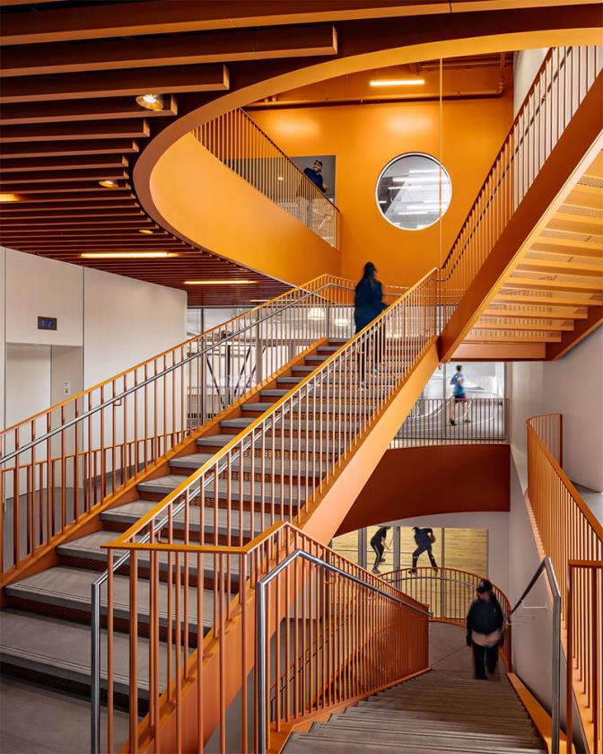 Al piano superiore, spazi di comunità e apprendimento — tra cui una cucina didattica, sale per attività extrascolastiche e il Dr. Roy A. Hastick Sr. Media Lab, dedicato alla produzione A/V e alle competenze digitali — si affacciano su terrazze e giardini pensili panoramici che estendono la fruizione all’aperto. La presenza di un tetto verde continuo di quasi 800 m2 non solo offre aree silenziose di relazione, ma si inserisce nel più ampio impegno verso strategie climatiche urbane, rendendo l’edificio più resiliente e riducendo l’effetto isola di calore.