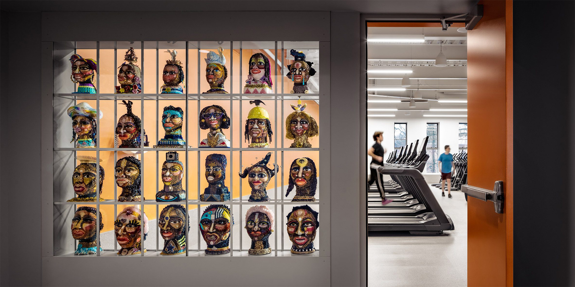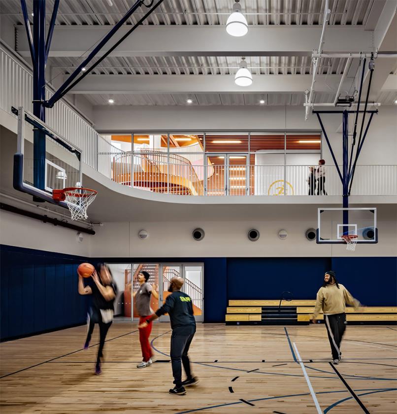 La facciata curva in mattone scandita da grandi finestre ad arco introduce la luce naturale in profondità negli spazi interni e crea un forte dialogo visivo con la piazza pubblica e il contesto urbano circostante, ridefinendo il confine tra spazio pubblico e struttura ricreativa. Questa massiccia apertura verso l’esterno riflette l’intento di Studio Gang di concepire l’architettura come “interfaccia di comunità”, dove sport, cultura e apprendimento si intrecciano in un continuum spaziale.
