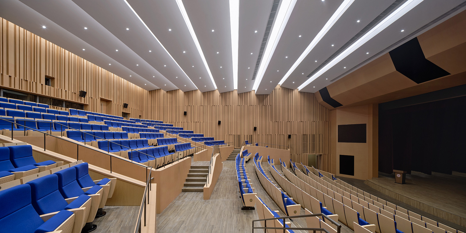 Un elemento chiave del progetto è la dimensione della circolazione verticale come spazio sociale. Le grandi scale e le rampe non sono semplici dispositivi di connessione, ma diventano luoghi di incontro e attraversamento, favorendo una fruizione informale e continua dell’edificio.