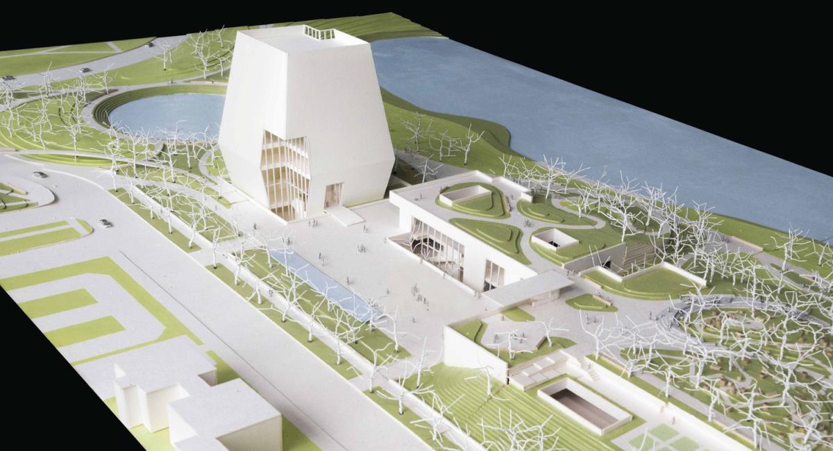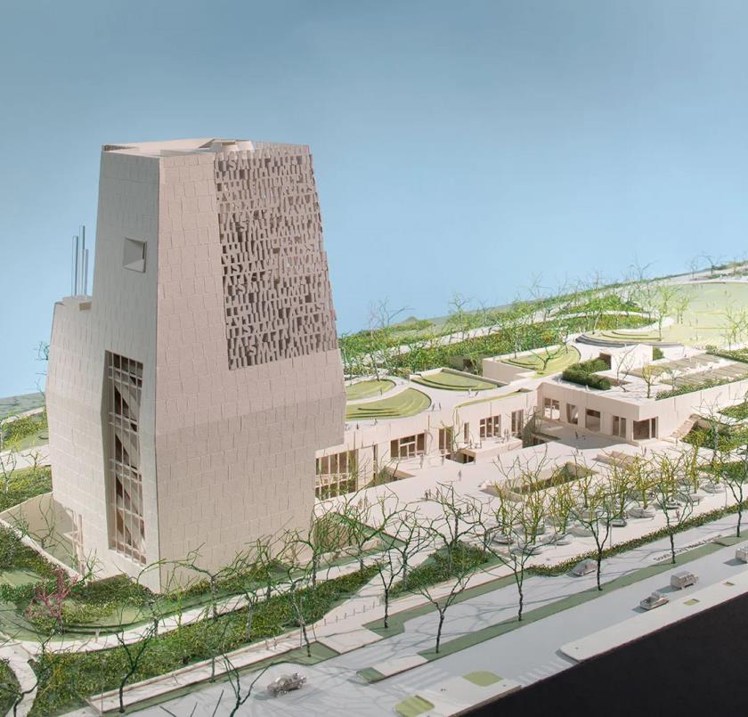 L’elemento architettonico più riconoscibile del complesso è la Museum Building, una torre monolitica alta circa 68 metri che domina il campus e funge da riferimento visivo nel paesaggio urbano.