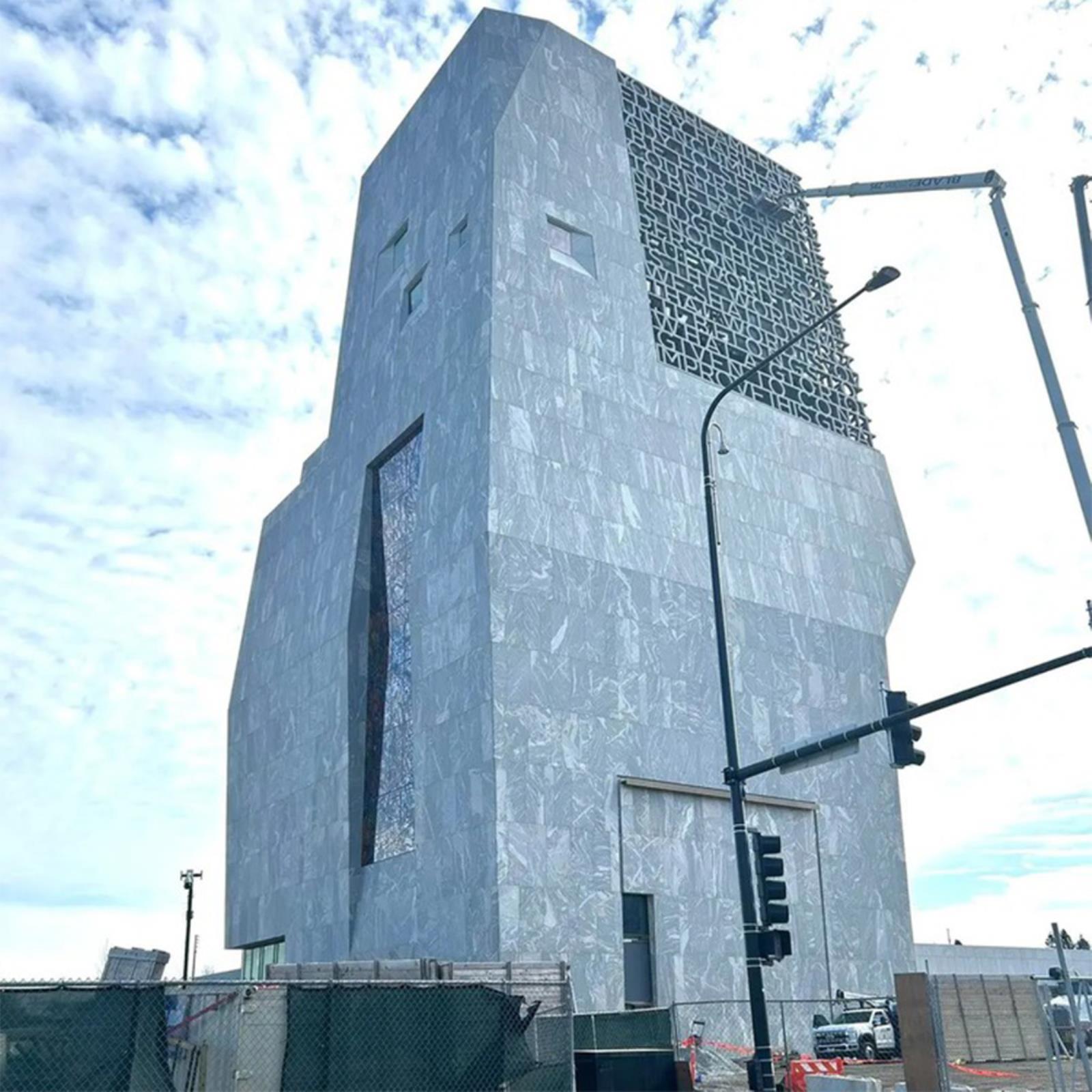 La torre museo è rivestita con lastre di granito proveniente dal New Hampshire, una scelta che garantisce durabilità e al tempo stesso una forte presenza materica. Il rivestimento lapideo accentua il carattere monolitico dell’edificio e ne rafforza l’immagine di struttura scolpita.