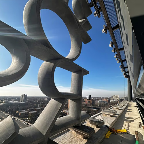 La materialità dell’Obama Presidential Center è dominata da una combinazione di calcestruzzo strutturale e rivestimenti in granito, utilizzati per conferire all’edificio un carattere solido e monumentale.