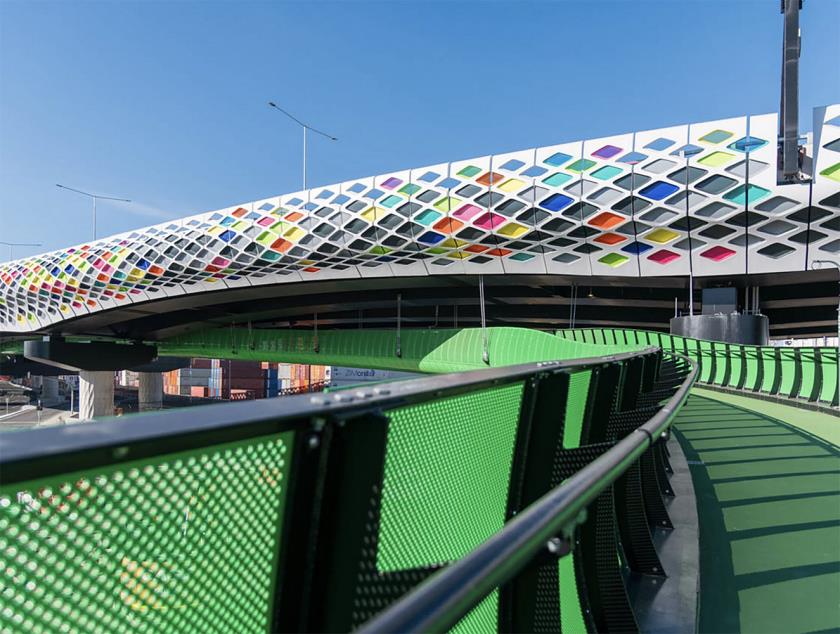 Il progetto include anche la Dixon Veloway, una velocissima corsia ciclabile di 1,5 km, dedicata al collegamento tra Footscray e il centro, che si inserisce nel più ampio disegno di una città che promuove la mobilità lenta e sostenibile. Questa infrastruttura per biciclette non è un semplice segmento di percorso: è un elemento segnaletico urbano di grande forza visiva, con colori e materiali che dialogano con quelli delle altre componenti del progetto.
