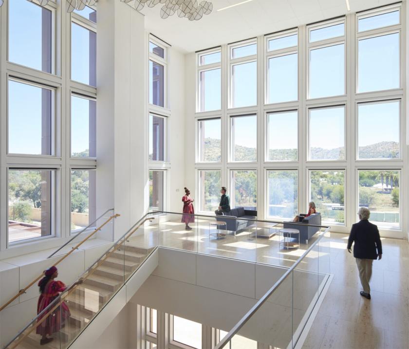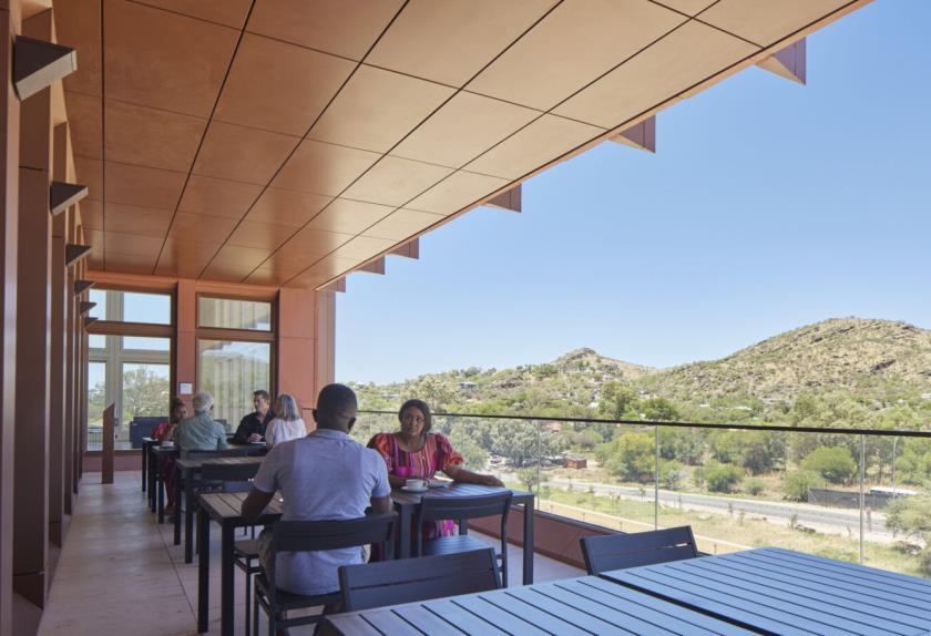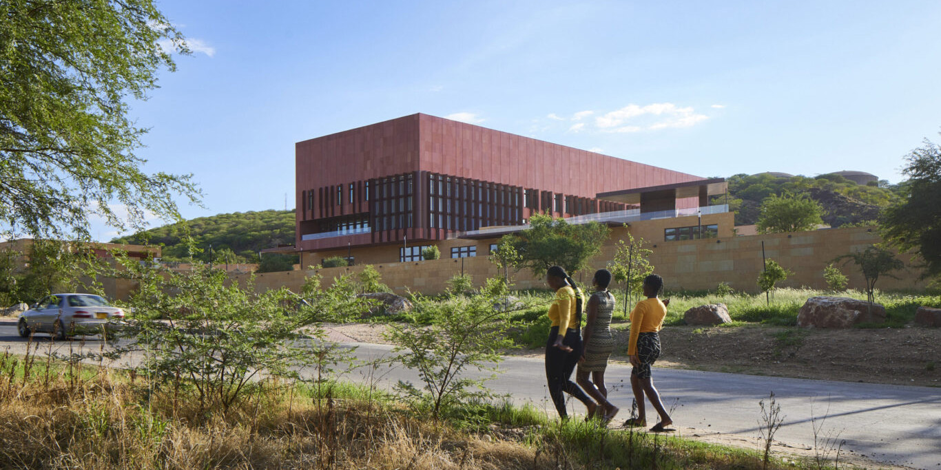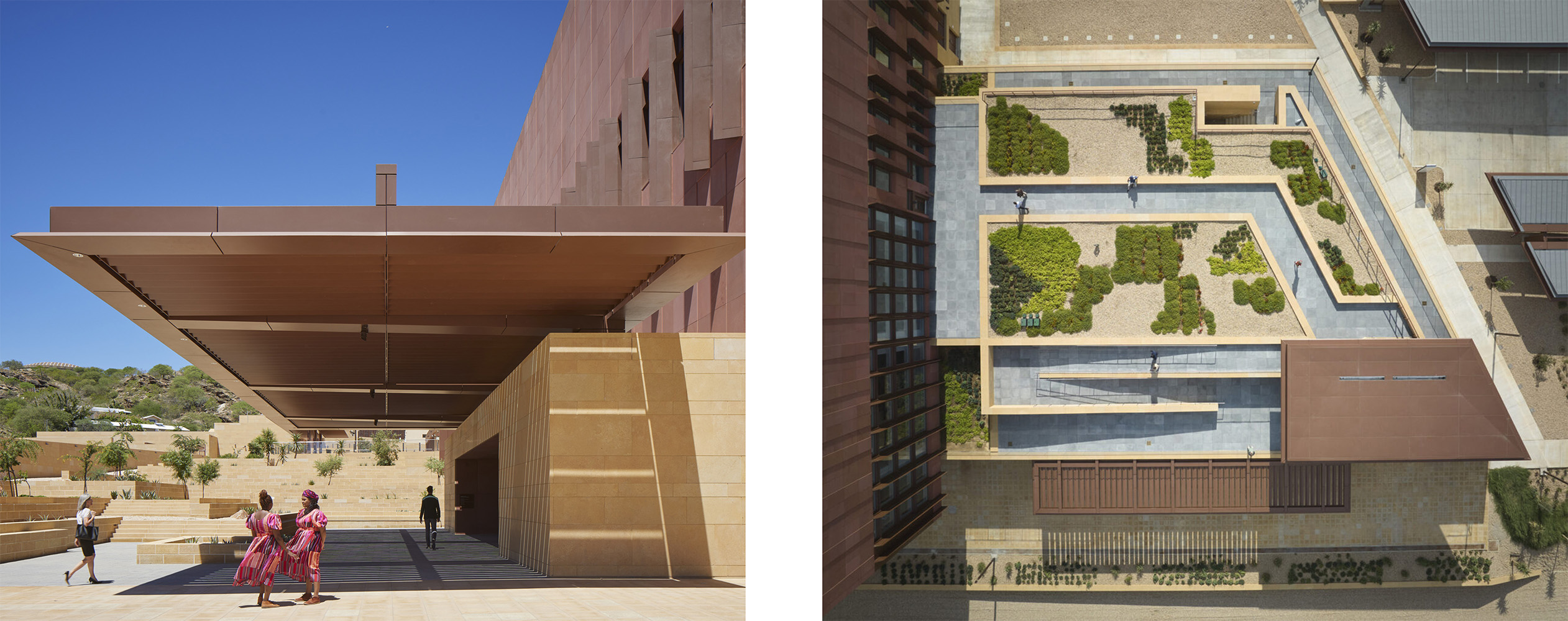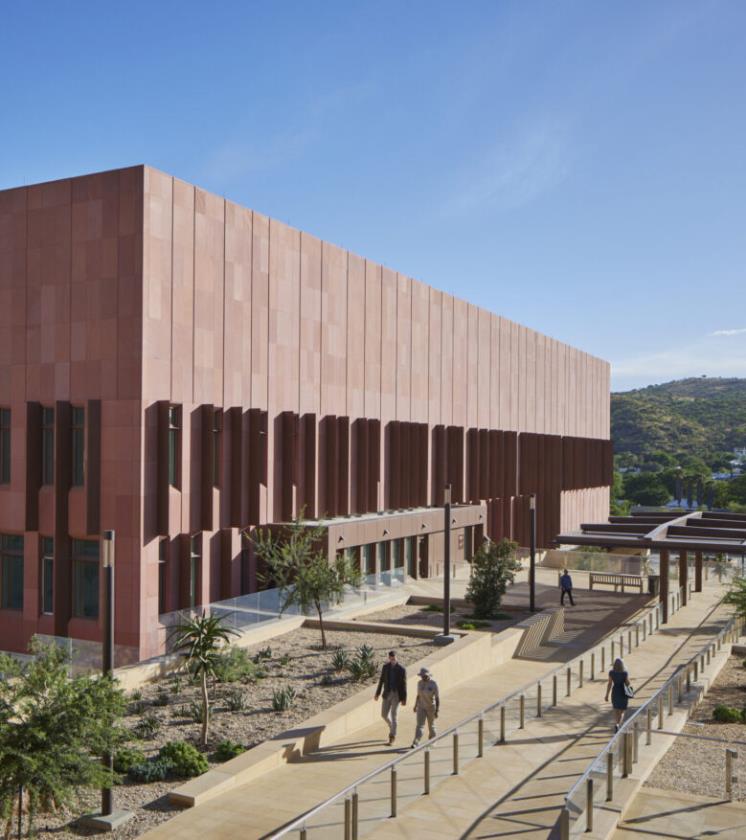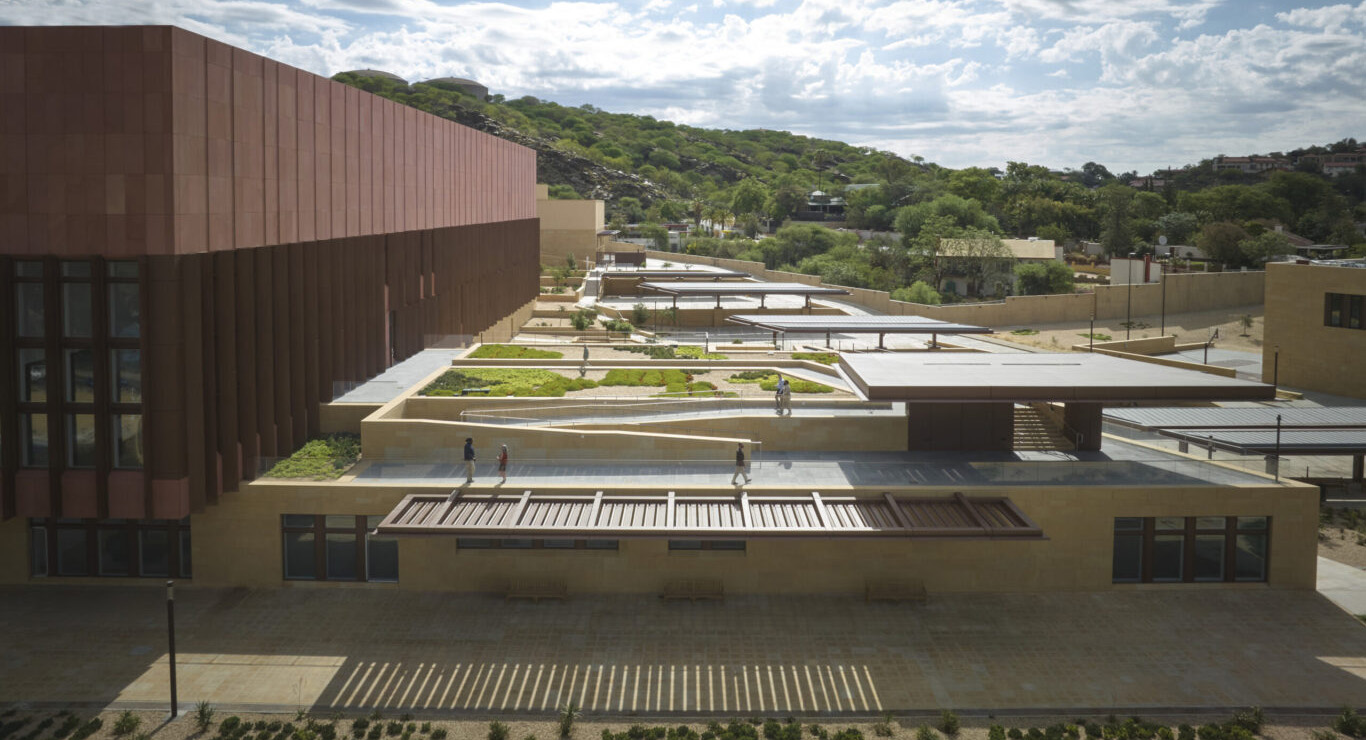 Il fronte si veste di pietra calcarea gialla alla base — eco delle dolci tonalità africane — e di arenaria rossa nella parte superiore, evocando le sabbie del Sossusvlei. Così il progetto prende il colore del luogo, quasi appartenesse da sempre a questo paesaggio arido e luminoso. I giardini terrazzati che accompagnano i percorsi d’accesso sono piantati con specie autoctone, capaci di vivere senza irrigazione artificiale, mentre i volumi sono schermati da frangisole verticali inclinati e logge aggettanti, capaci di modulare la luce e mitigare l’irraggiamento.