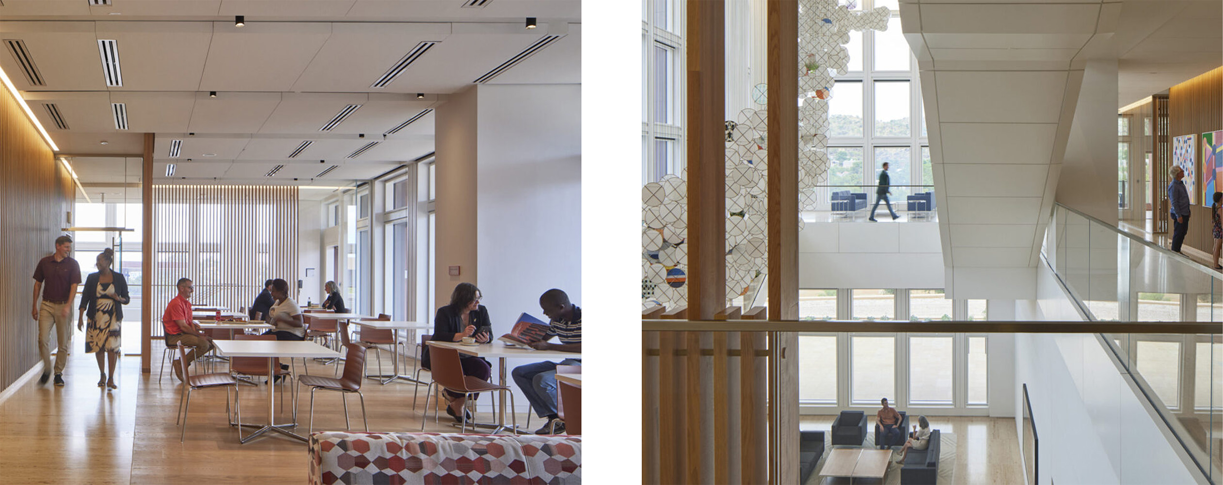 All’interno, lo spazio si apre in un atrio a triplo volume, luogo di incontro, cerimonia, scambio culturale. Gallerie, terrazze, spazi comuni, elementi lignei e schermi verticali compongono un ambiente che mescola flessibilità e presenza monumentale. Le aree operative si dispongono con piani adattabili nel tempo: un’architettura che respira, si trasforma, dialoga.