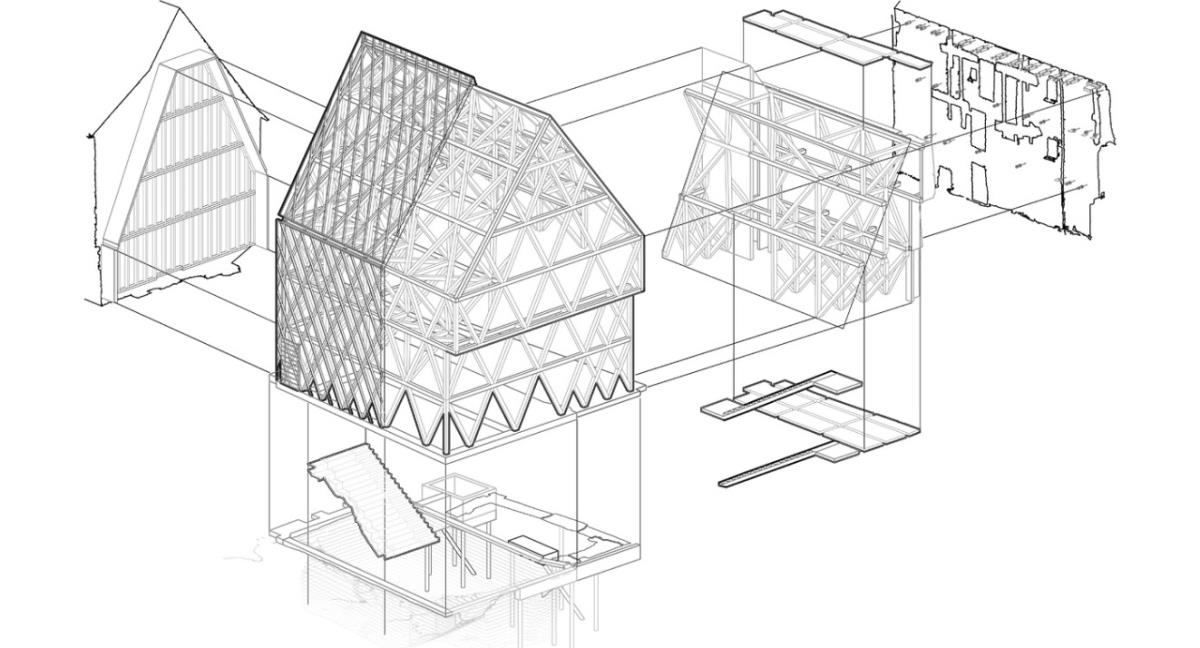 Il telaio interno non è una semplice reinterpretazione del Fachwerk tradizionale, ma una struttura evoluta composta da una sottostruttura tripla, formata da elementi lignei disposti diagonalmente e orizzontalmente in sovrapposizione.