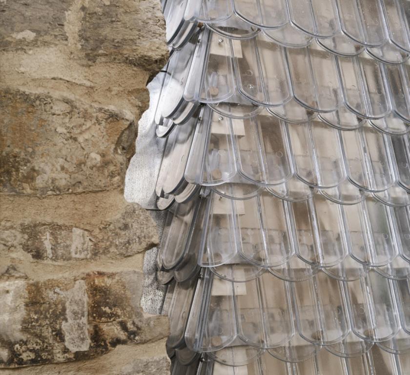 Le tegole sono realizzate in vetro colato pieno, prodotto tramite fusione e successivo raffreddamento controllato, processo che conferisce al materiale una superficie leggermente irregolare e una traslucenza non perfettamente uniforme. Questa caratteristica è fondamentale: a differenza del vetro industriale standard, il vetro colato introduce una diffusione anisotropa della luce, evitando effetti di trasparenza diretta e garantendo una percezione più morbida e stratificata dell’involucro.