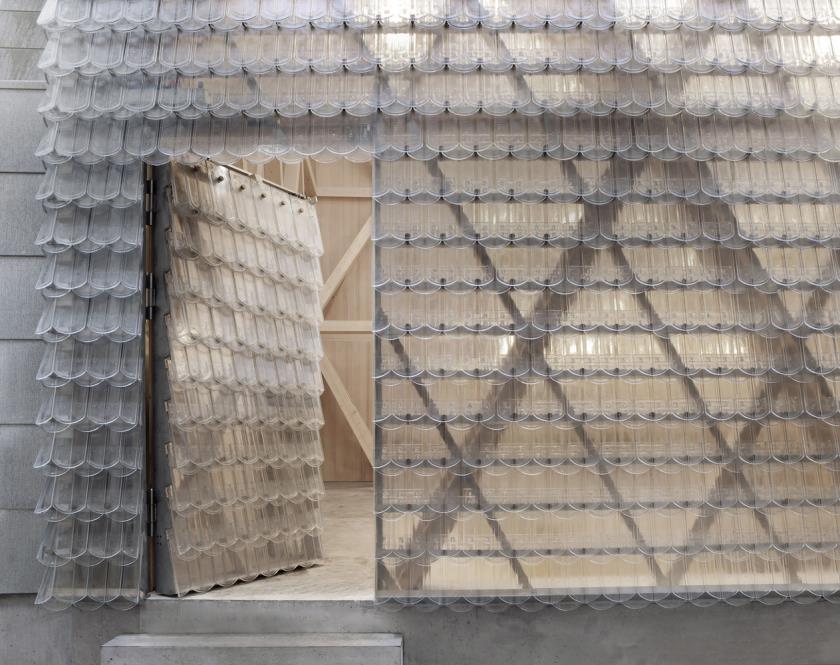 Uno degli aspetti più innovativi del progetto è l’involucro esterno, realizzato con tegole in vetro colato a forma di “coda di castoro”, applicate in modo continuo su copertura e facciate.