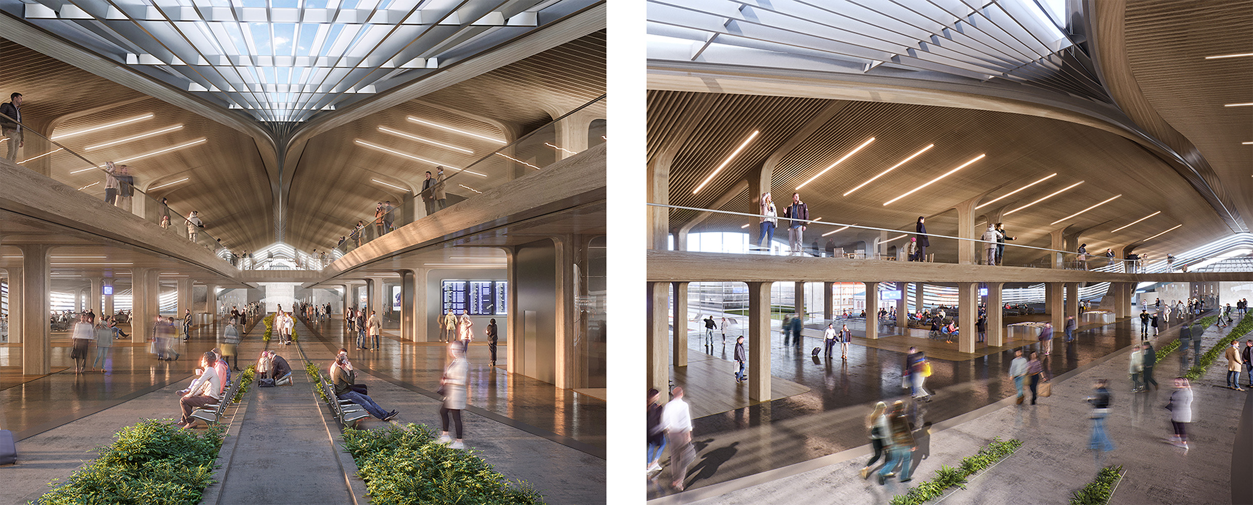 Sotto questo paesaggio, il terminal degli autobus interurbani potrà ospitare comodamente 1.400 passeggeri contemporaneamente.