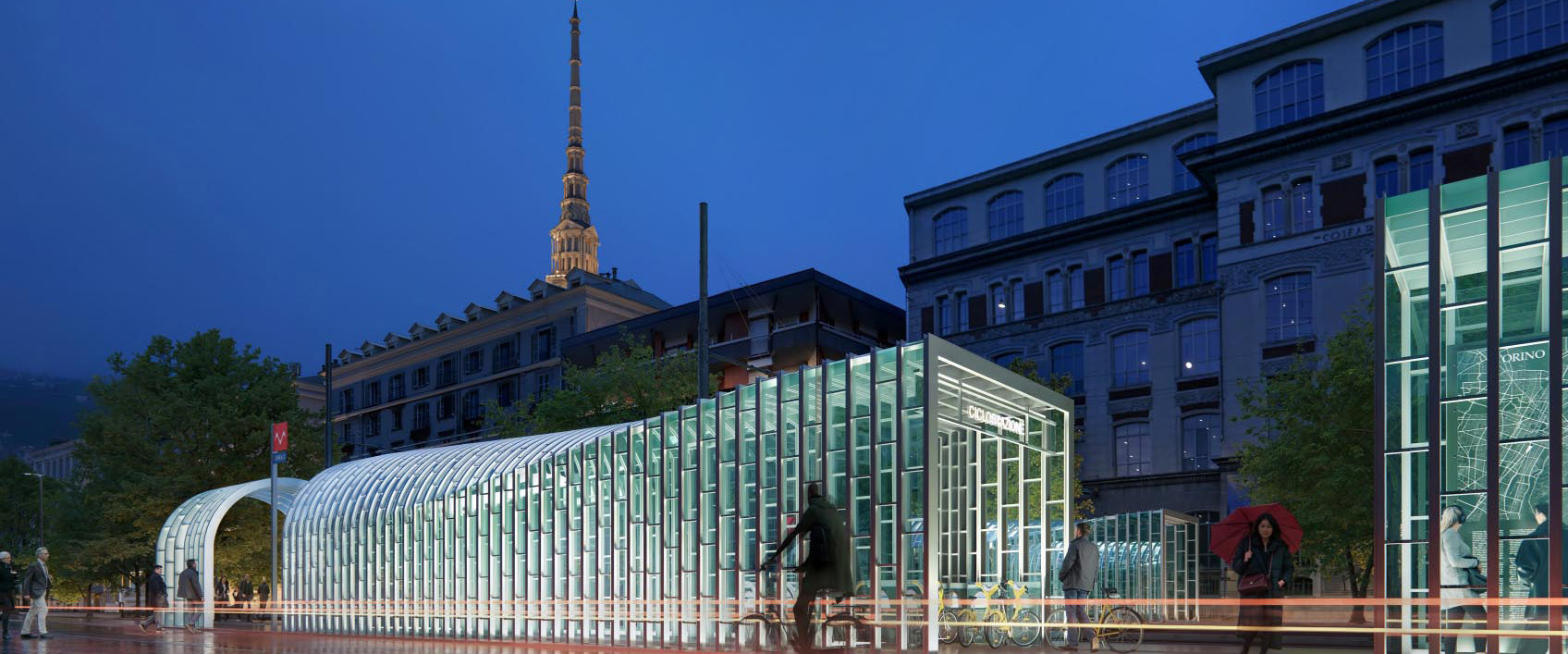 Secondo le prime immagini e rendering, alcune stazioni — come quella di San Giovanni Bosco — accoglieranno i passeggeri con arcate leggere che richiamano i portici tipici della città, mentre nel centro storico fermate come Piazza Carlo Alberto saranno caratterizzate da strutture in vetro quasi impalpabili, pensate per dialogare con il tessuto urbano storico.